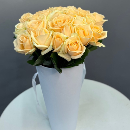 25 кремовых роз в конусе